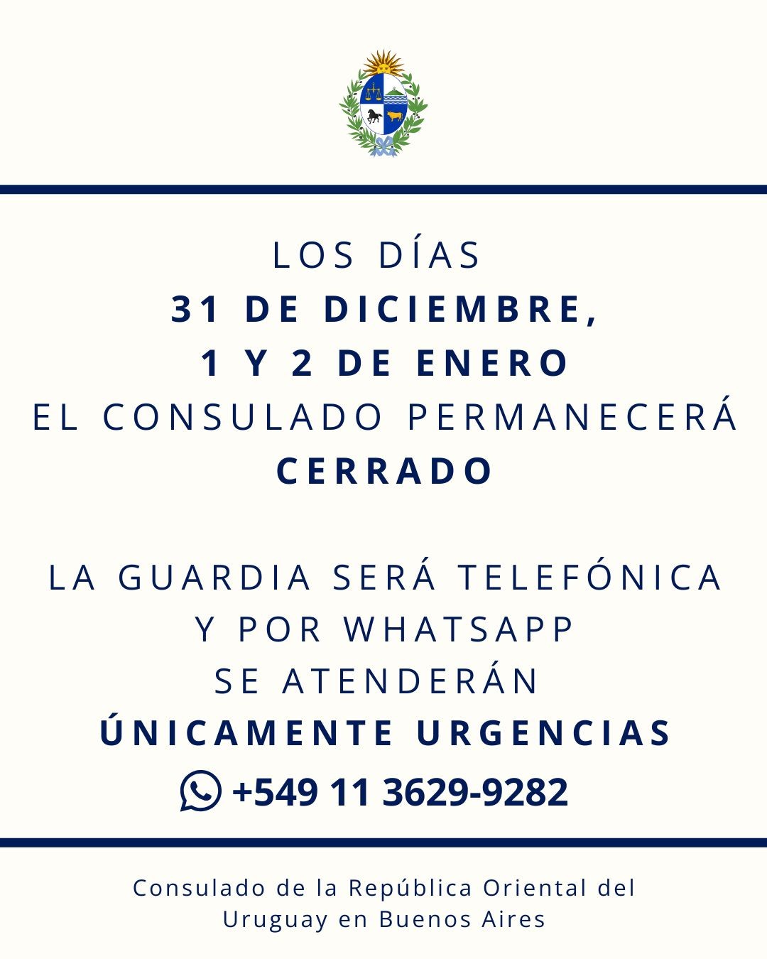 <p>LOS DIAS 31 DE DICIEMBRE, 1 Y 2 DE ENERO EL CONSULADO PERMANECERA <strong>CERRADO</strong>.</p><p>LA GUARDIA SERA TLEFONICA Y POR WHATSAPP</p><p>SE ATENDERAN</p><p><strong>UNICAMENTE URGENCIAS</strong></p><p><strong>+549 11 3629-9282</strong></p>